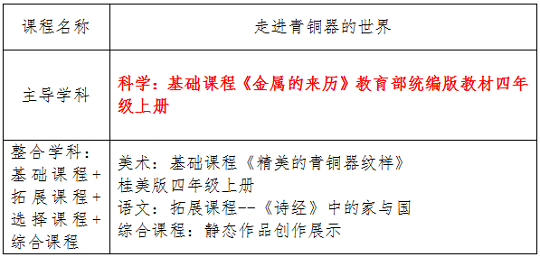 我想我世界之走进青铜器的世界,以科学学科《金属的来历》为主导,整合语文、美术、综合实践等学科,了解青铜器冶炼技术、器形、纹样、探寻青铜器的发展历史、结合拓展课程“走进博物馆”,实地目睹青铜器的风采,在《诗经》中感受青铜文化传递的爱国情怀,感受青铜器之美,坚定文化理解和认同,培养学生民族自信心。