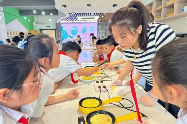 柏林庄学校看到,学校以鸡蛋为主要食材,让学生化身“厨房小达人”,开启了一场与鸡蛋的奇妙邂逅。活动中,学校邀请家长志愿者走进校园,为学生们讲解了如何制作鸡蛋饼、蛋挞、蛋糕等食物。家长志愿者一边示范一边讲解,同学们围在旁边,眼睛紧紧盯着每一个动作,生怕错过任何一个细节。伴随着滋滋的声响,同学们观察面糊从液态变成“金毯”的过程,手中的铲子不时翻面,做出了一张张金黄的鸡蛋饼。烤蛋挞环节中,同学们分工明确,进行着打蛋、搅拌蛋液、摆放蛋挞皮、倒蛋液等准备工作。随着烤箱“叮”的一声清脆提示音,他们迫不及待地打开烤箱门,一股浓郁的奶香与蛋香扑鼻而来,瞬间弥漫了整个教室,看着一个个金黄诱人、身披酥脆外皮的蛋挞,同学们感受到满满的成就感。